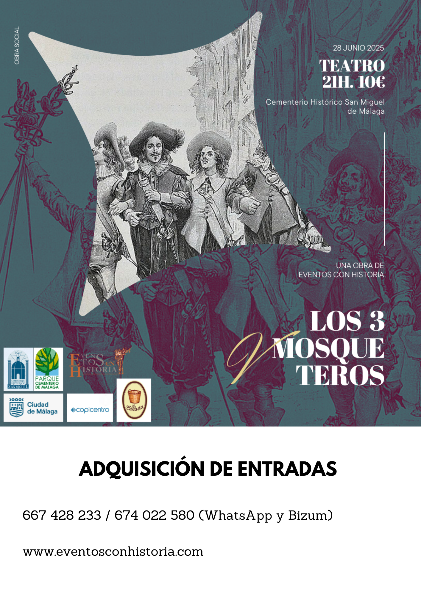 Sábado 28 a las 21:00h. Eventos con Historia nos trae la obra teatral LOS 3 MOSQUETEROS. Se requiere entrada.